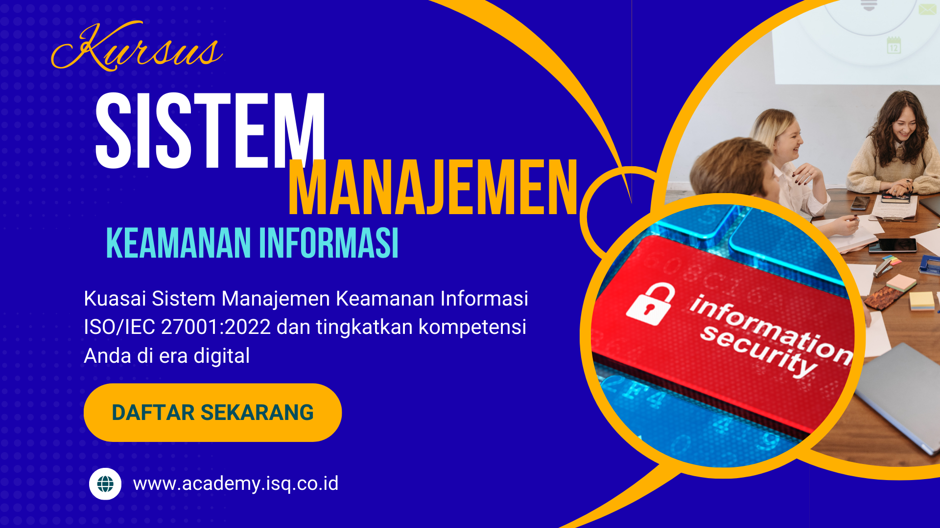 Kursus ini memberikan pemahaman mengenai konsep, prinsip, dan penerapan Sistem Manajemen Keamanan Informasi berdasarkan standar ISO/IEC 27001:2022. Materi mencakup pentingnya perlindungan informasi, identifikasi aset informasi, pengelolaan risiko keamanan informasi, serta penerapan kontrol keamanan untuk menjaga kerahasiaan, integritas, dan ketersediaan informasi.